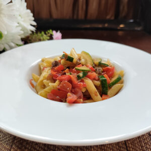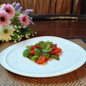 Sweet bell peppers with capers and olives, gently sautéed in garlic and olive oil.