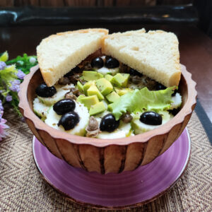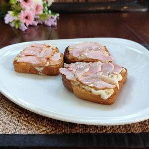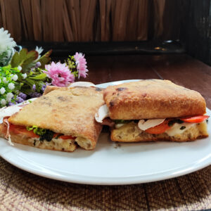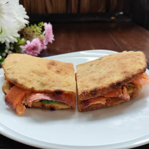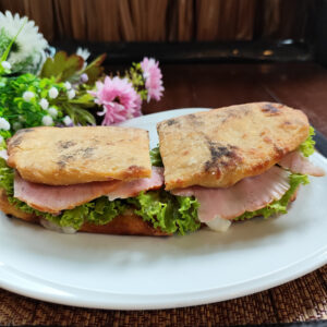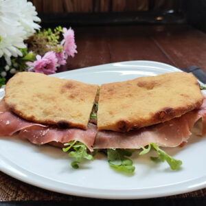 Made with soft toast bread dipped in egg, butter, salad, tomatoes and a choice of: cooked ham or Parma ham or spicy salami.