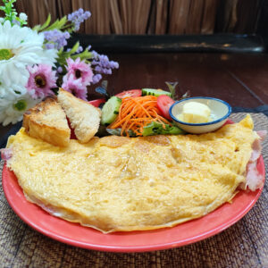 Italian-style omelette with mozzarella and ham, served with salad, tomato, and warm buttered toast.
