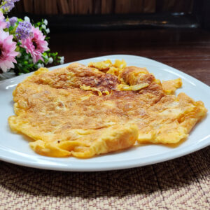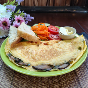 Onion omelette with mushrooms, fresh tomato, and morning glory, paired with buttered toast.