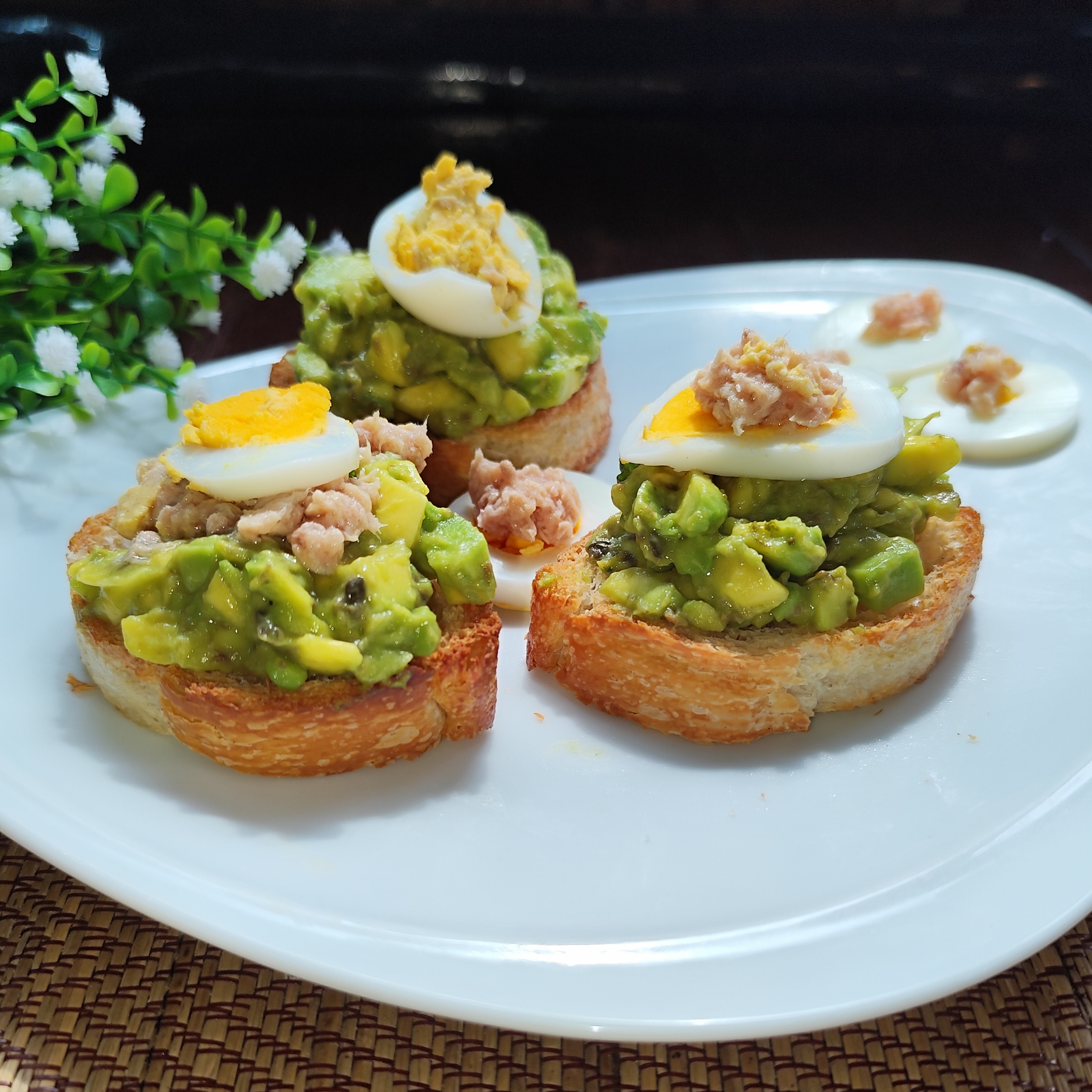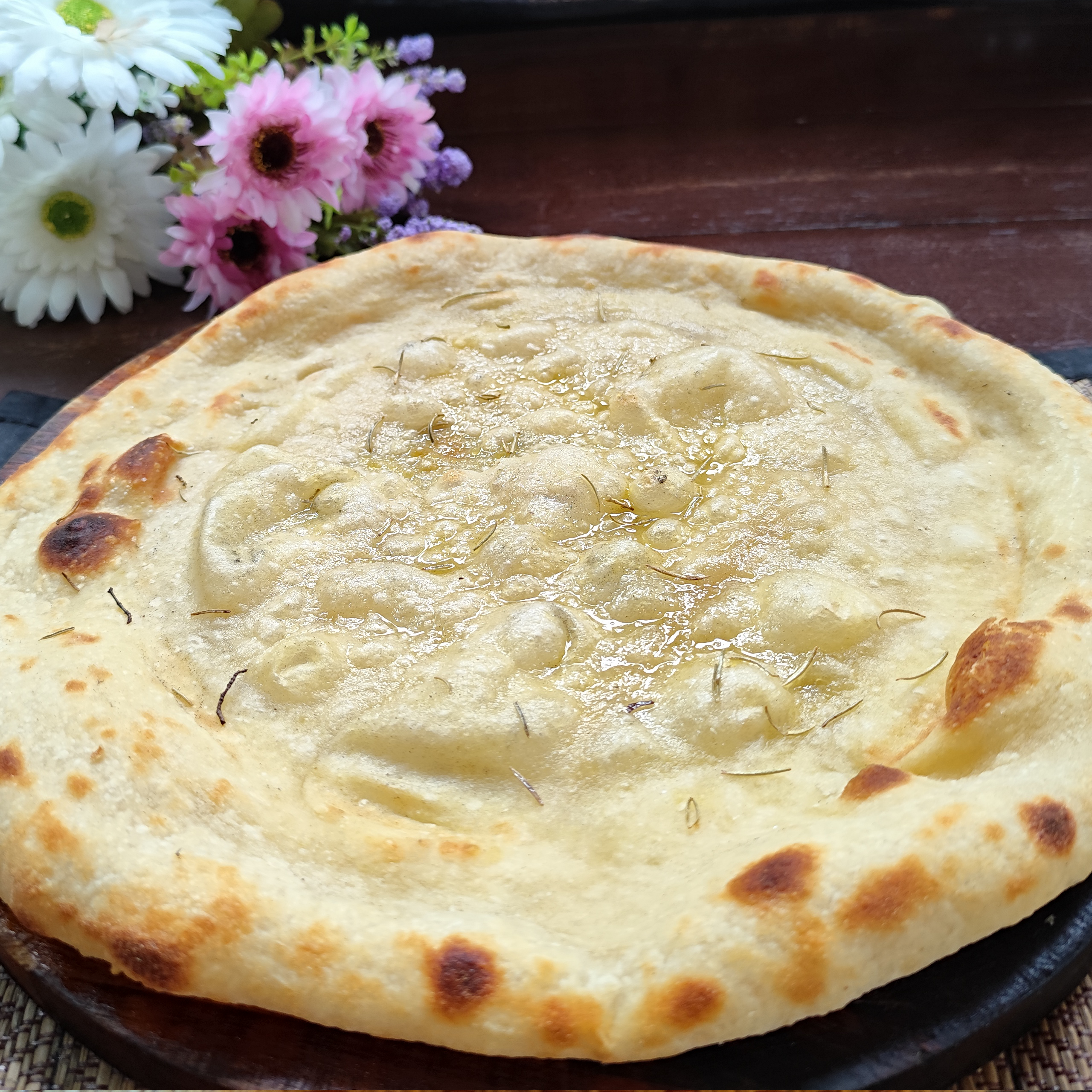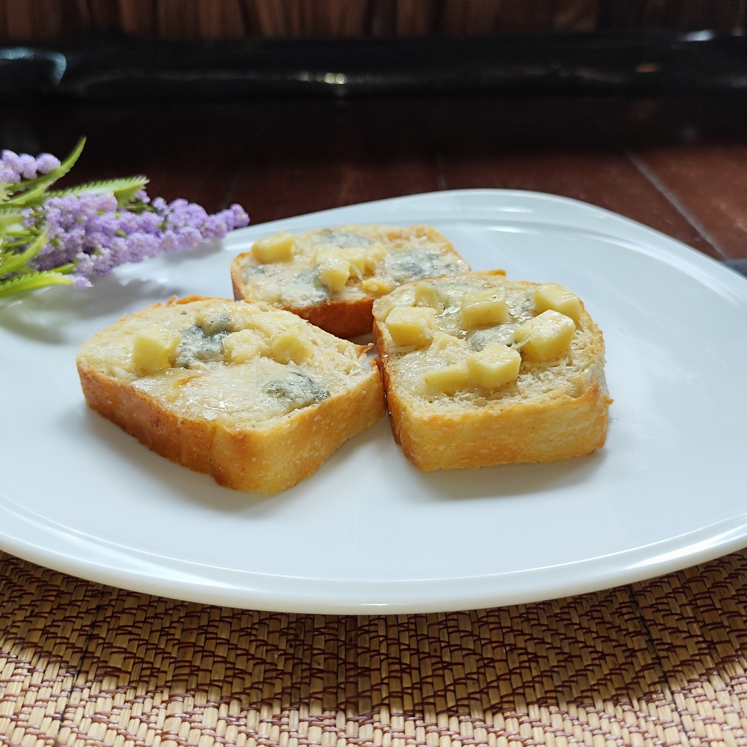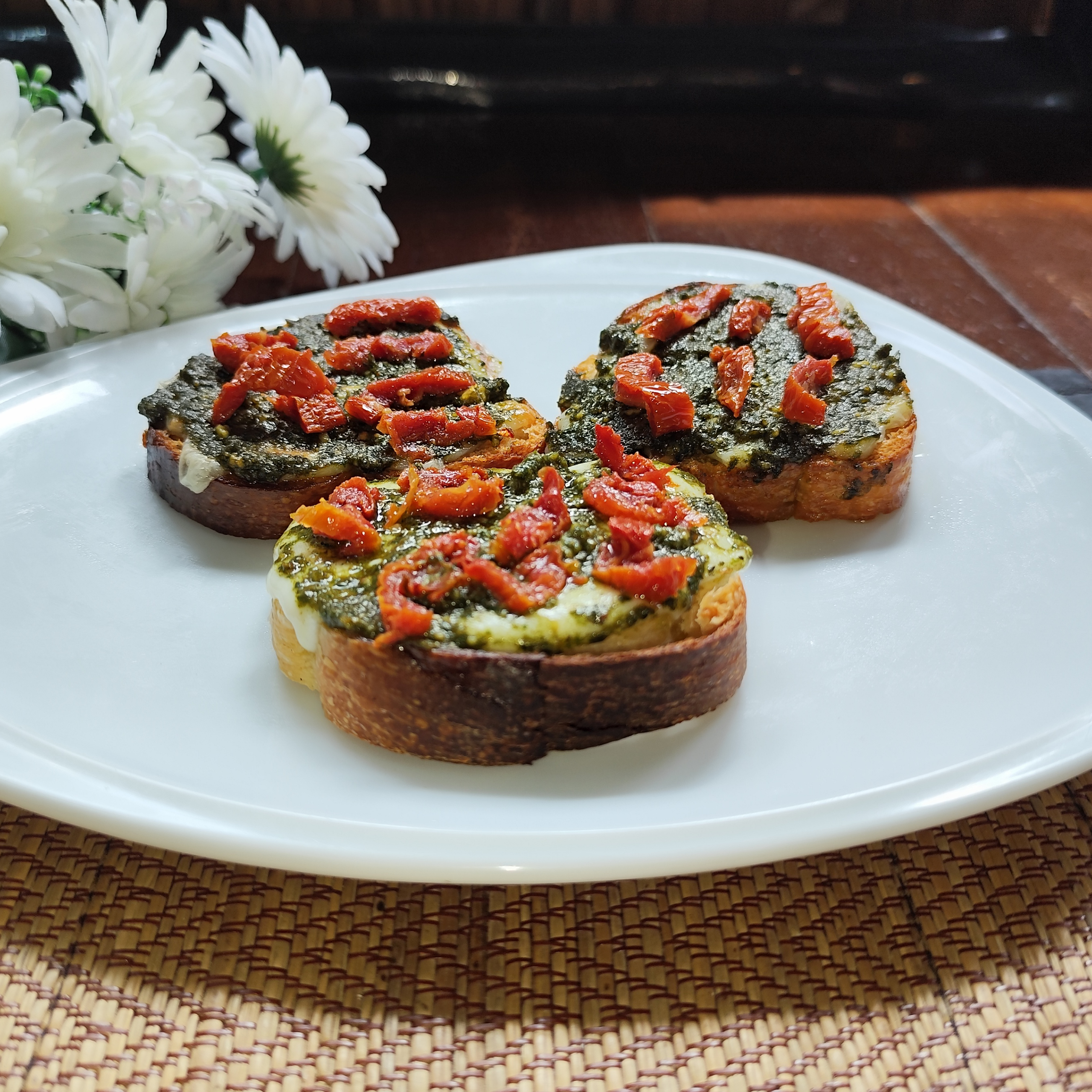 Slices of homemade bread, lightly toasted and topped with extra virgin olive oil and fresh Italian basil. The perfect base for a selection of delicious toppings.
