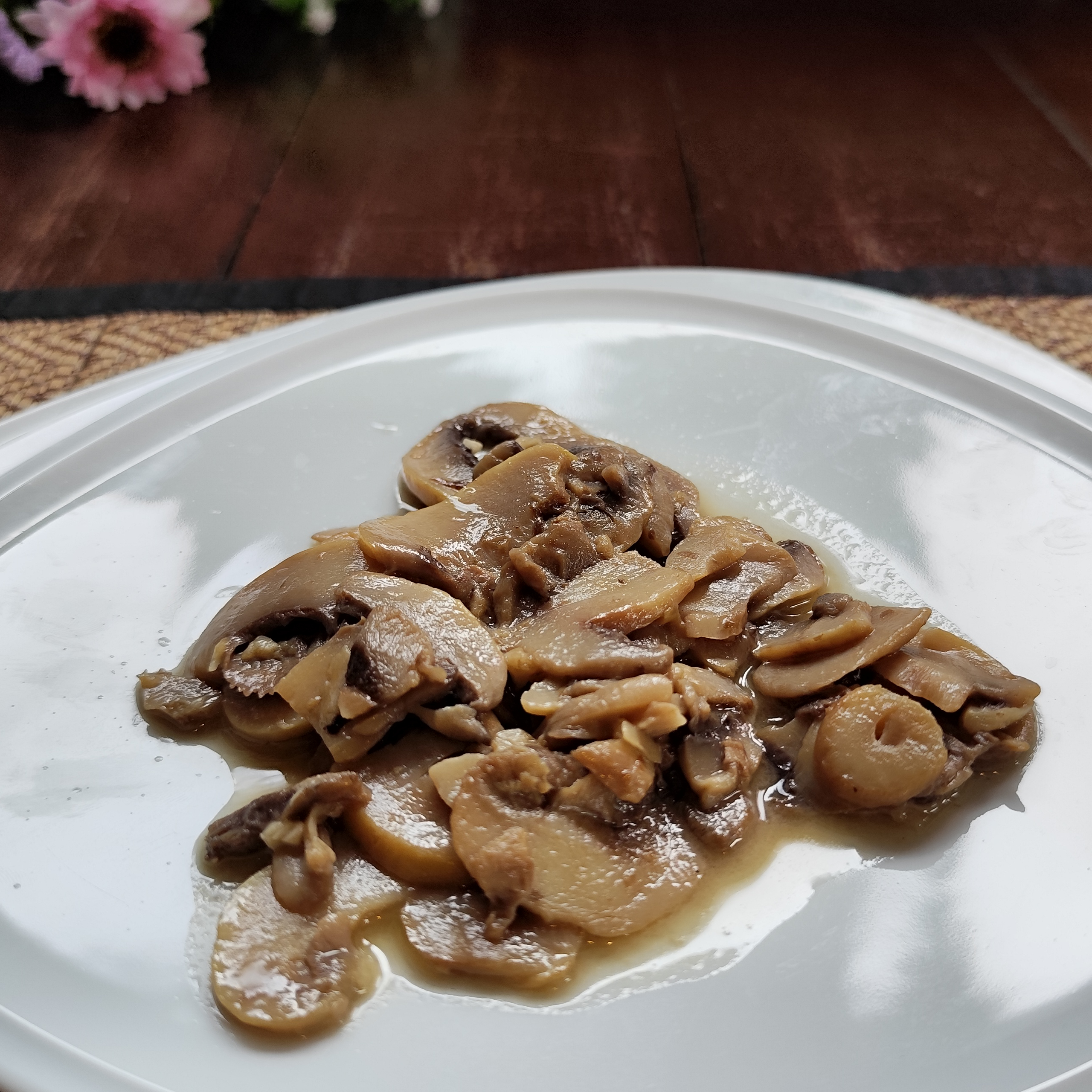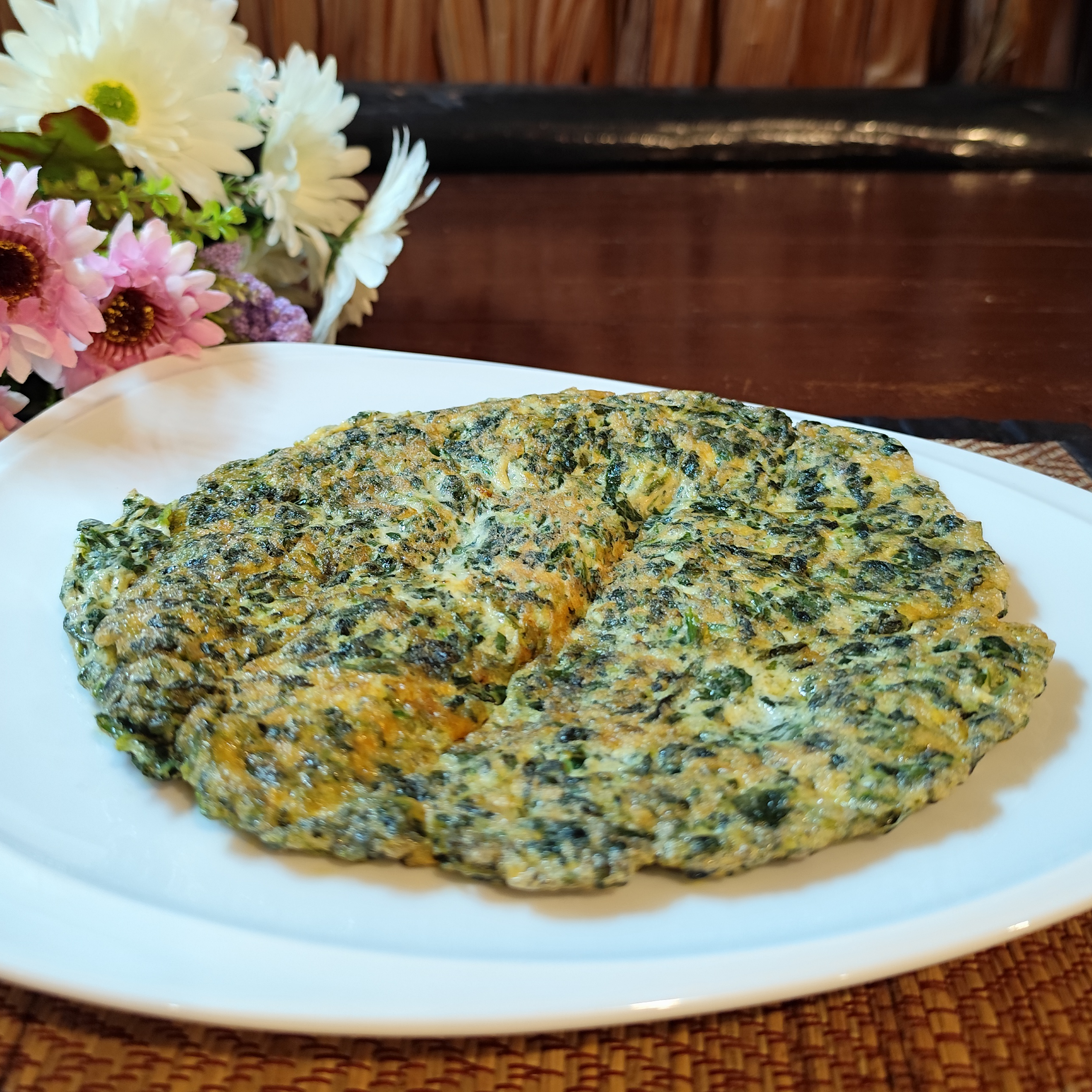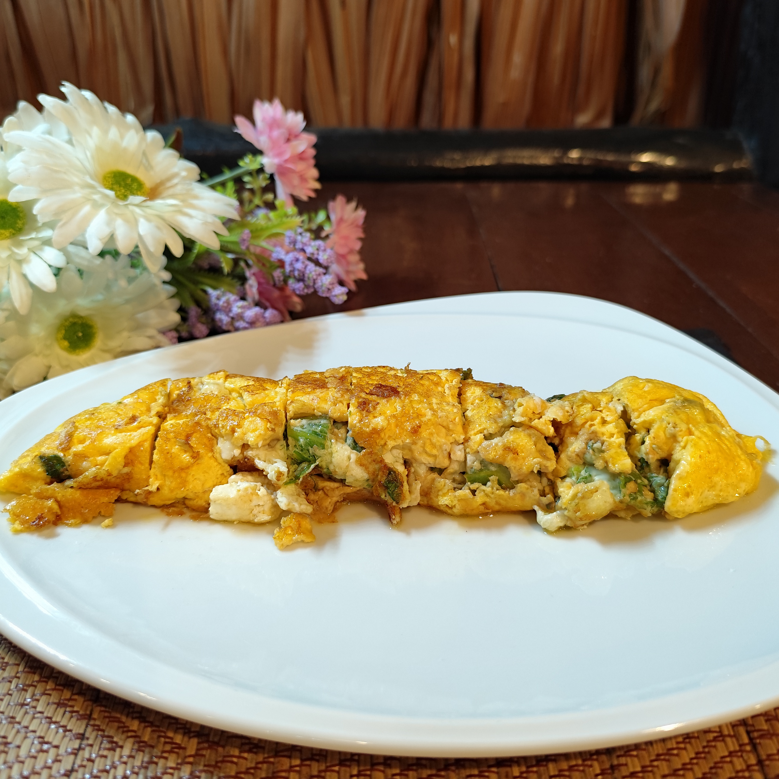 Onion omelette with mushrooms, fresh tomato, and morning glory, paired with buttered toast.