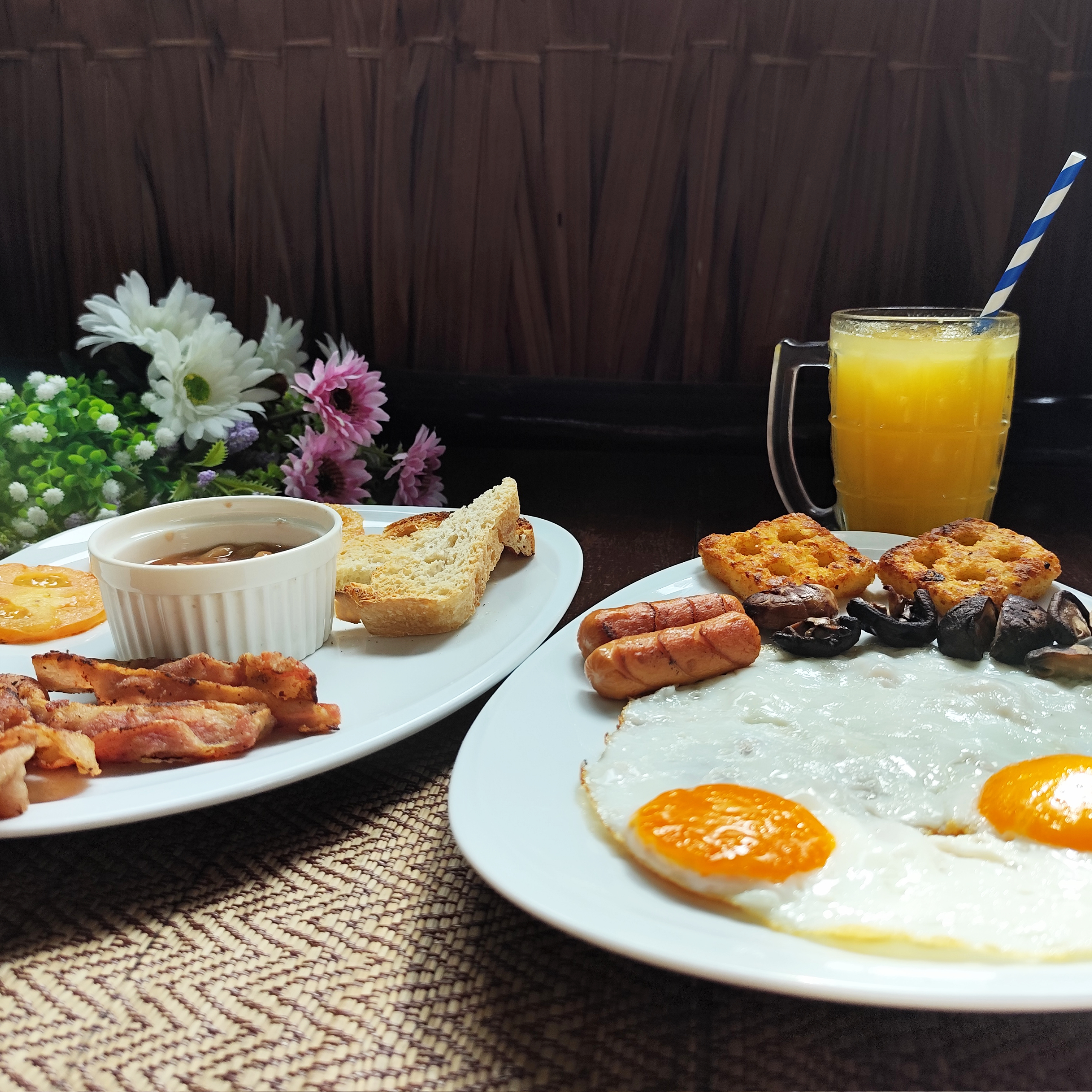 British breakfast with bacon, eggs, sausage, beans, mushrooms, hash brown, tomato and orange juice.
