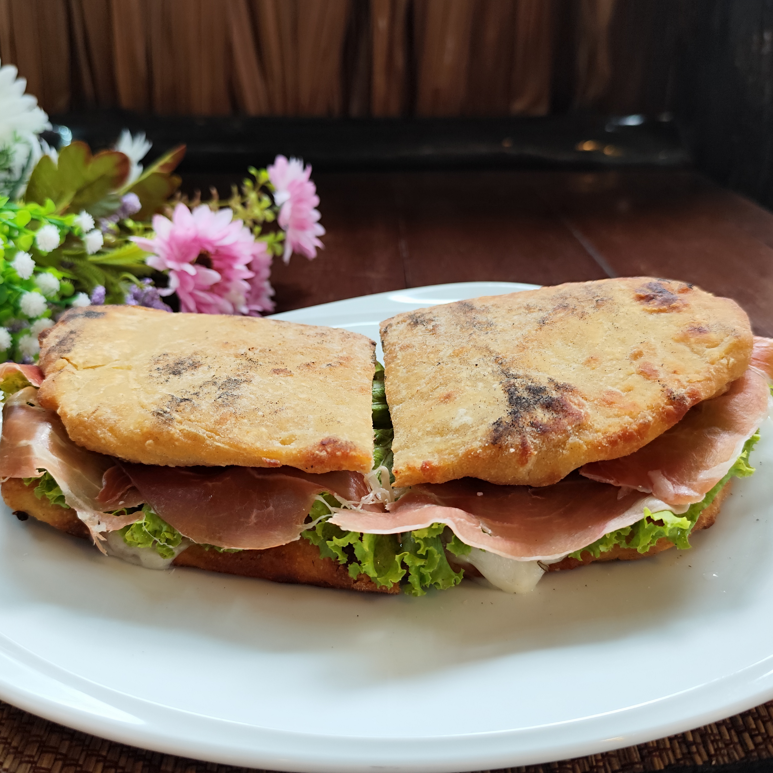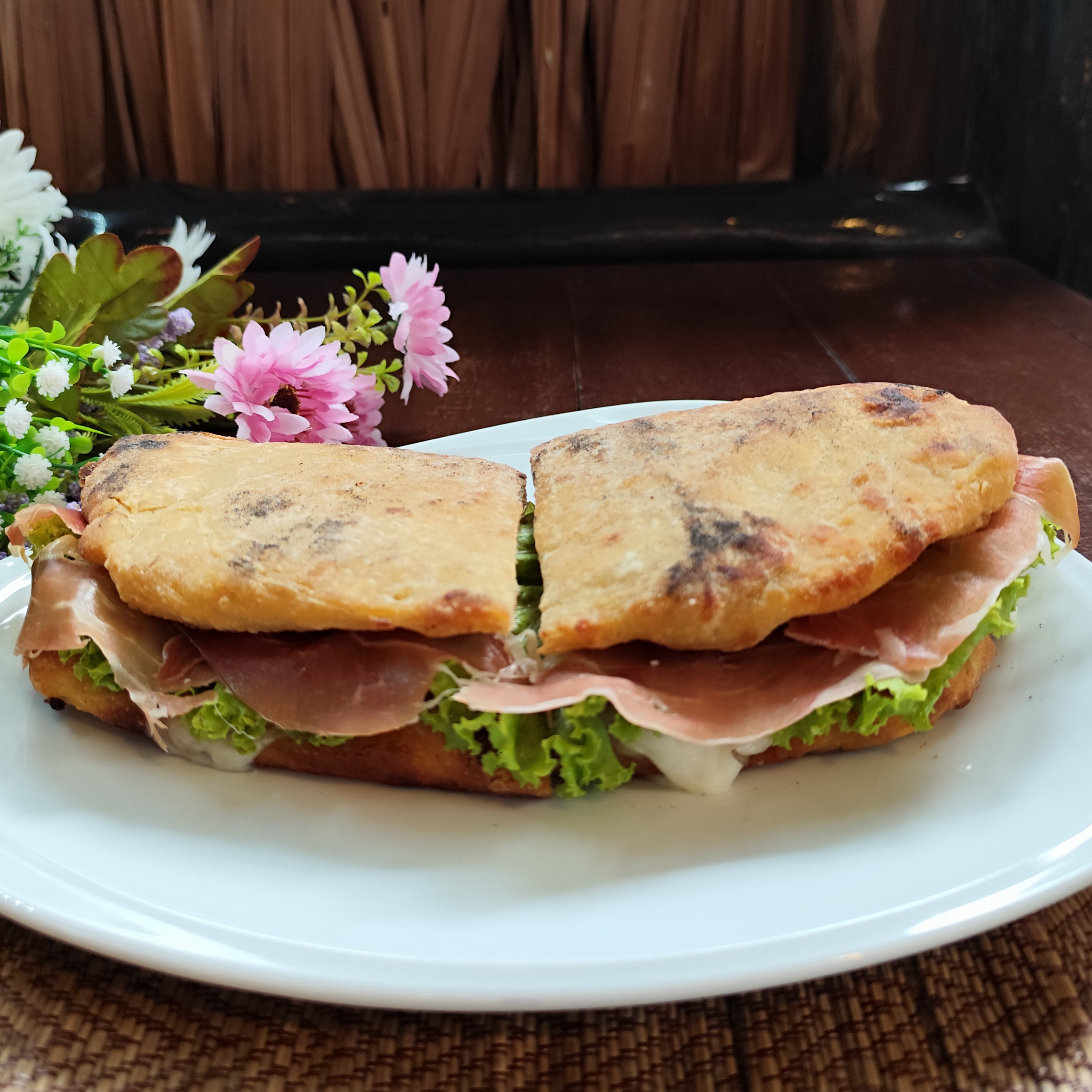 Made with soft toast bread dipped in egg, butter, salad, tomatoes and a choice of: cooked ham or Parma ham or spicy salami.