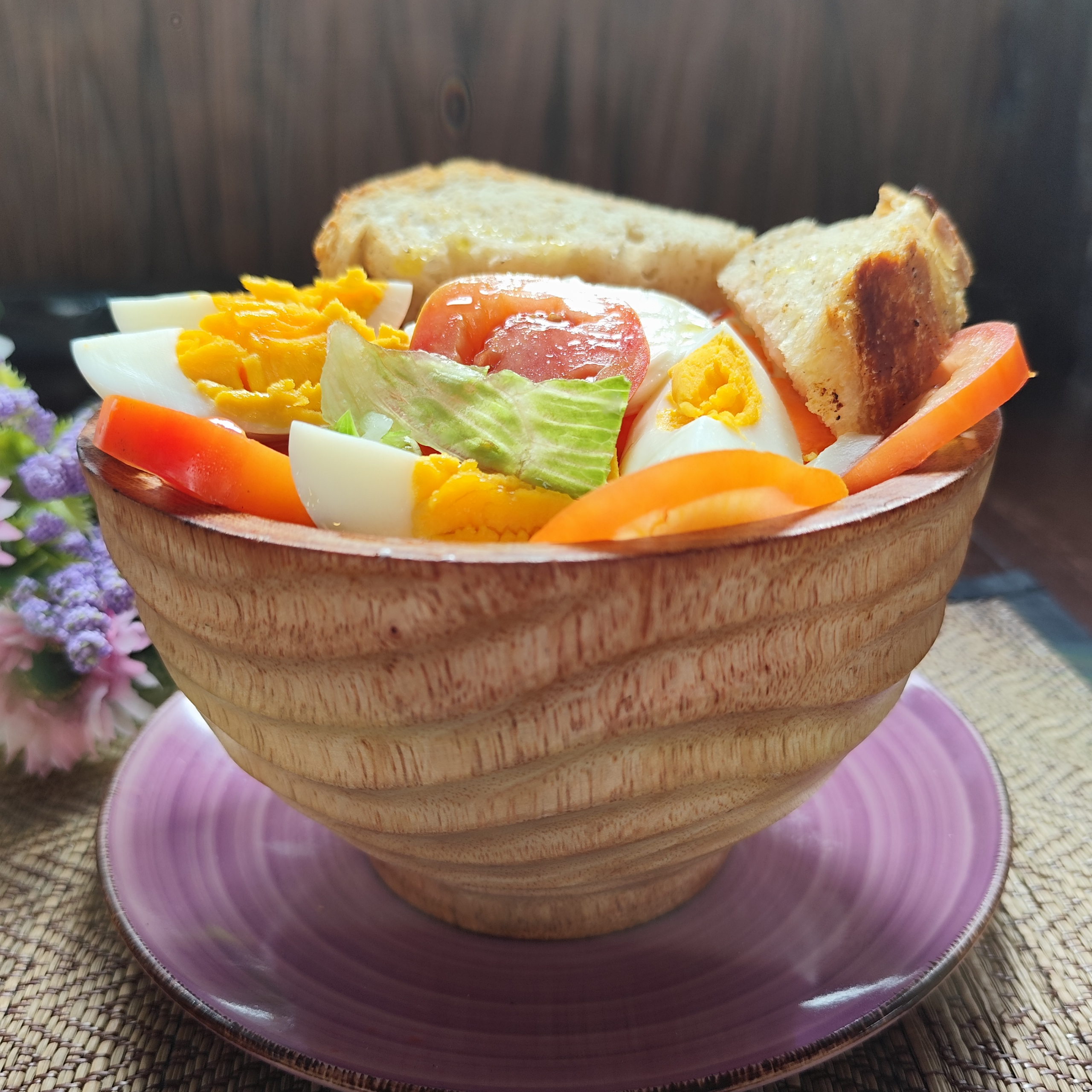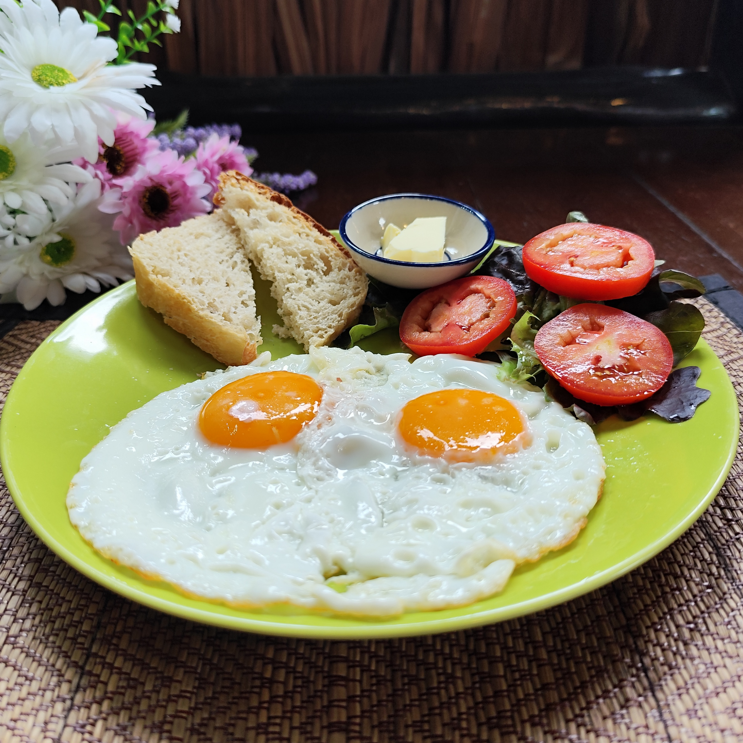 A simple, fresh start with eggs your way, crisp salad, ripe tomato, and buttery toast.