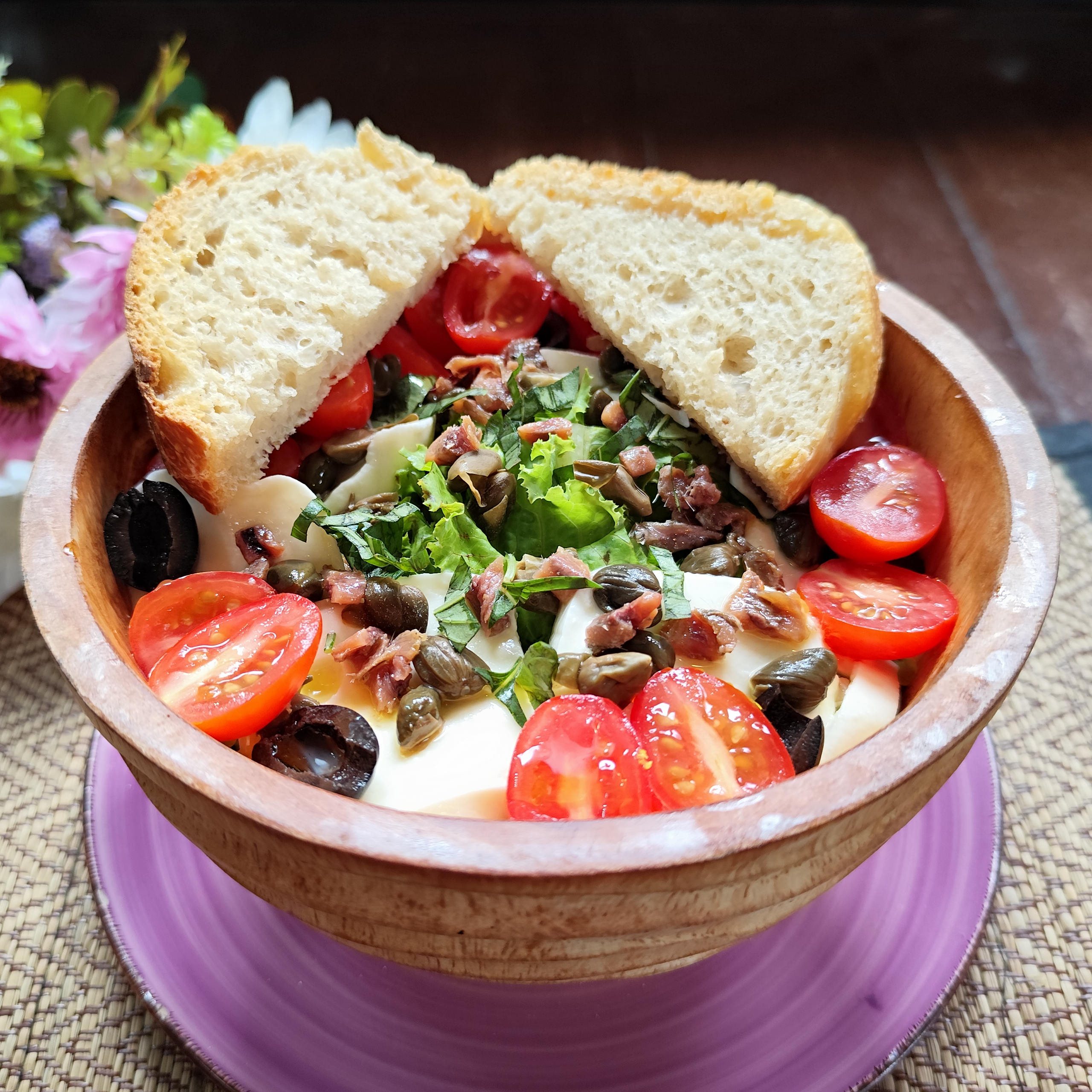 Salads served with homemade toasted bread. We use only Italian basil, extra virgen olive oil and fresh mozzarella. All ingredients are fresh daily.