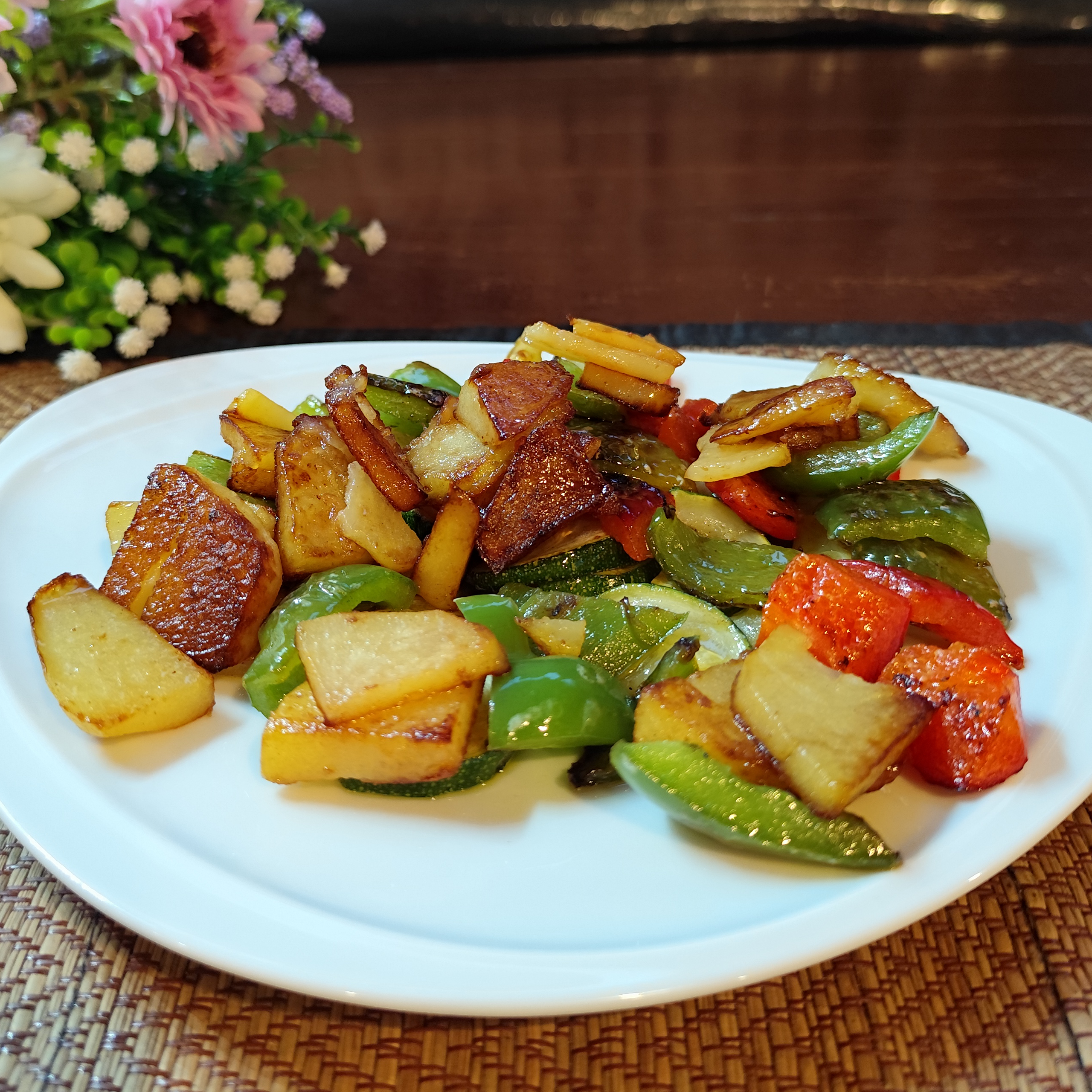 A colorful mix of potatoes, zucchini, and peppers sautéed with garlic and olive oil.