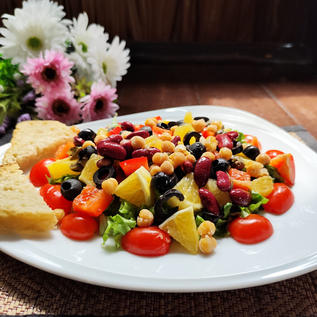 IngredientsBeans, Bell pepper, Black olives, Cherry tomatoes, Chickpeas, Green lattuce, Oil, Orange