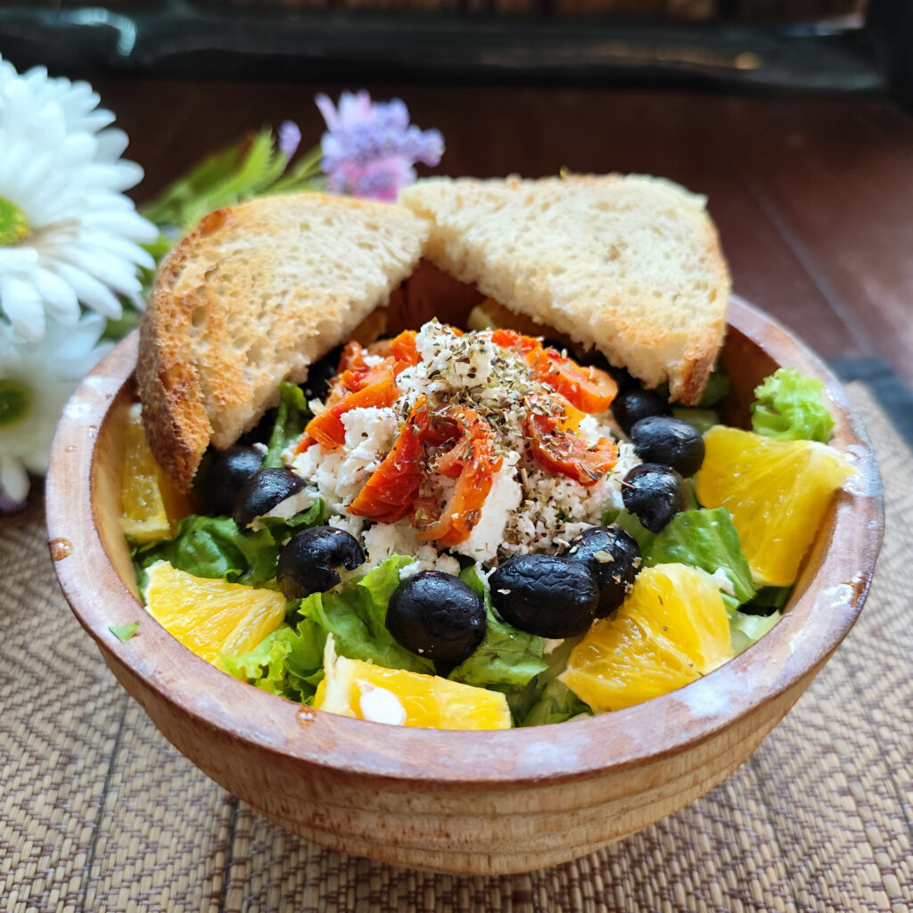 IngredientsFeta cheese, Green lattuce, Oil, Olives, Orange, Oregano, Sun-dried tomatoes