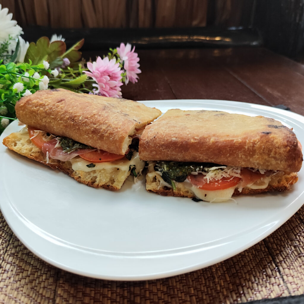 IngredientsBasil pesto, Mozzarella, Oil, Parma ham, Parmesan, Tomatoes